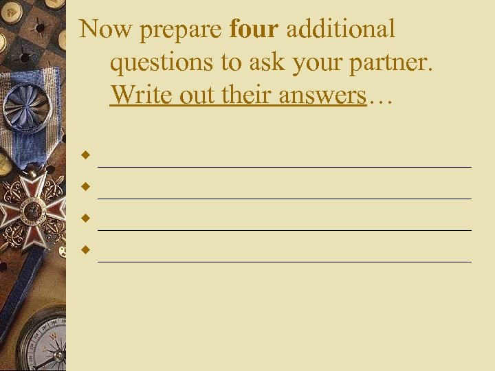 Now prepare four additional questions to ask your partner. Write out their answers… w __________________________________