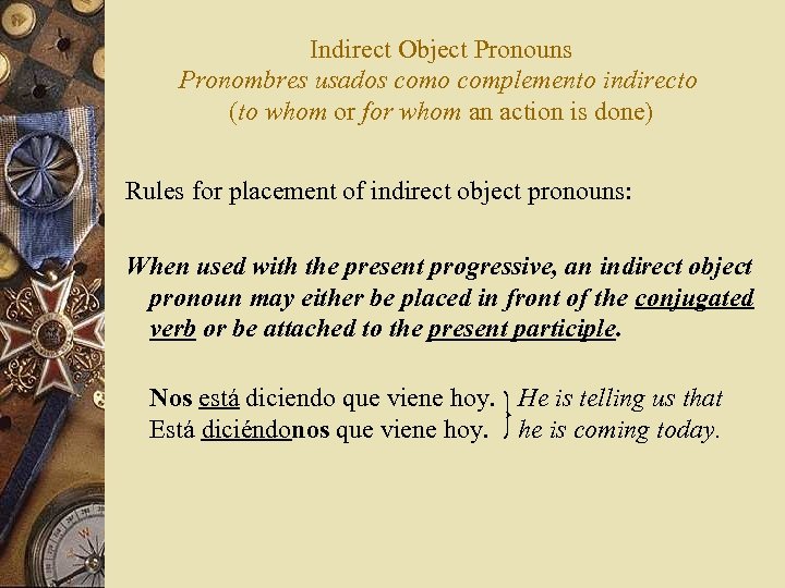Indirect Object Pronouns Pronombres usados como complemento indirecto (to whom or for whom an action is done) Rules for placement of indirect object pronouns: When used with the present progressive, an indirect object pronoun may either be placed in front of the conjugated verb or be attached to the present participle. Nos está diciendo que viene hoy. He is telling us that Está diciéndonos que viene hoy. he is coming today.