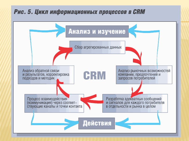 Основные принципы Наличие единого хранилища информации, куда собираются сведения о взаимодействии с клиентами. Использование многих каналов взаимодействия: обслуживание на точках продаж, телефонные звонки, электронная почта, мероприятия, встречи, регистрационные формы на веб-сайтах, рекламные ссылки, чаты, социальные сети. Анализ собранной информации о клиентах и подготовка данных для принятия соответствующих решений — например, сегментация клиентов на основе их значимости для компании, потенциальном отклике на те или иные промо-акции, прогнозе потребности в тех или иных продуктах компании. Этот подход подразумевает, что при взаимодействии с клиентом сотруднику компании доступна вся необходимая информация о взаимоотношениях с этим клиентом и решение принимается на основе этой информации (информация о решении, в свою очередь, тоже сохраняется).