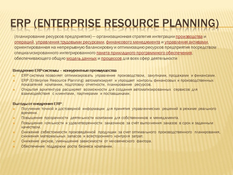 ERP (Enterprise Resource Planning) Внедрение ERP-системы – конкурентные преимущества ERP система позволяет оптимизировать управление производством, закупками, продажами и финансами. ERP (Enterprise Resource Planning) автоматизирует и упрощает контроль финансовых и производственных показателей компании, подготовку отчетности, планирование ресурсов. Открытая архитектура расширяет возможности для создания автоматизированных сервисов для взаимодействия с клиентами, партнерами и поставщиками. Выгоды от внедрения ERP : Получение точной и достоверной информации для принятия управленческих решений в режиме реального времени. Повышение прозрачности деятельности компании для собственников и менеджмента. Повышение лояльности и удовлетворенности заказчиков за счёт выполнения заказов в срок и заданным качеством. Снижение себестоимости произведённой продукции за счет оптимального производственного планирования, снижения материальных запасов и всестороннего контроля затрат. Снижение рисков, уменьшение зависимости от человеческого фактора. Обеспечение поддержки роста бизнеса компании. (планирование ресурсов предприятия) — организационная стратегия интеграции производства и операций, управления трудовыми ресурсами, финансового менеджмента и управления активами, ориентированная на непрерывную балансировку и оптимизацию ресурсов предприятия посредством специализированного интегрированного пакета прикладного программного обеспечения, обеспечивающего общую модель данных и процессов для всех сфер деятельности
