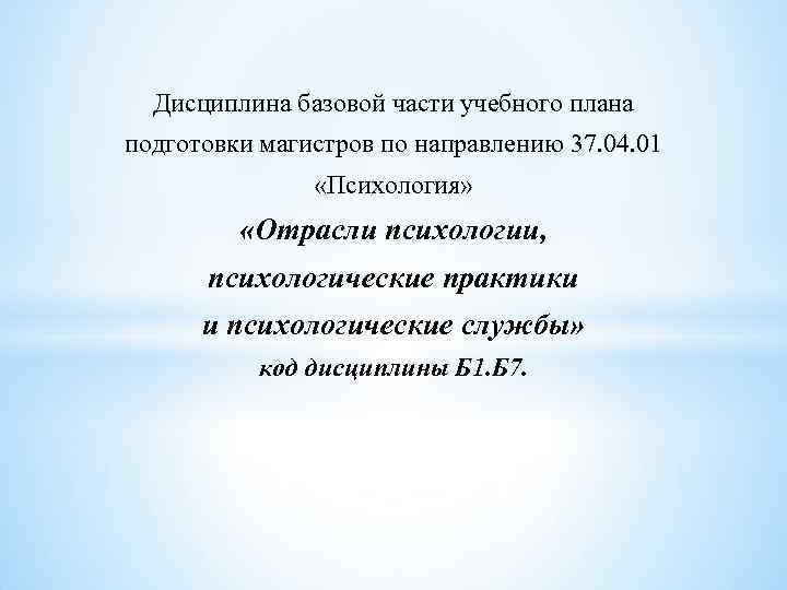 Дисциплина базовой части учебного плана подготовки магистров по направлению 37. 04. 01 «Психология» «Отрасли психологии, психологические практики и психологические службы» код дисциплины Б 1. Б 7.