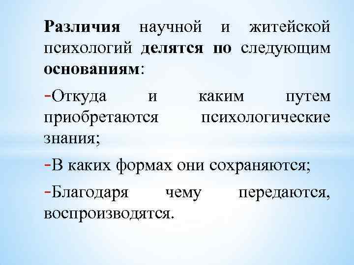 Различия научной и житейской психологий делятся по следующим основаниям: -Откуда и приобретаются знания; каким путем психологические -В каких формах они сохраняются; -Благодаря чему передаются, воспроизводятся.
