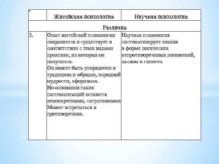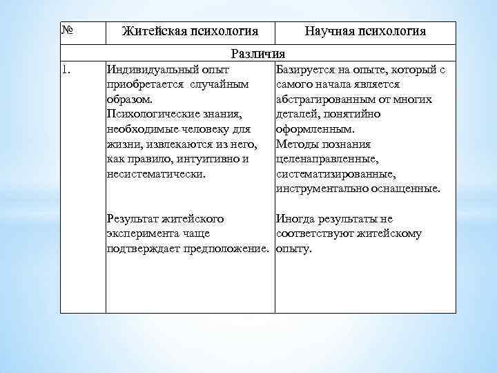 № Житейская психология Научная психология Различия 1. Индивидуальный опыт приобретается случайным образом. Психологические знания, необходимые человеку для жизни, извлекаются из него, как правило, интуитивно и несистематически. Базируется на опыте, который с самого начала является абстрагированным от многих деталей, понятийно оформленным. Методы познания целенаправленные, систематизированные, инструментально оснащенные. Результат житейского Иногда результаты не эксперимента чаще соответствуют житейскому подтверждает предположение. опыту.
