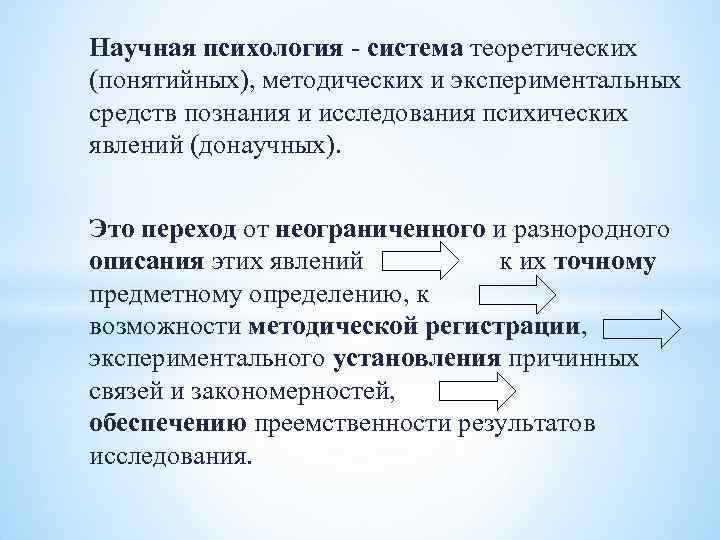 Научная психология - система теоретических (понятийных), методических и экспериментальных средств познания и исследования психических явлений (донаучных). Это переход от неограниченного и разнородного описания этих явлений к их точному предметному определению, к возможности методической регистрации, экспериментального установления причинных связей и закономерностей, обеспечению преемственности результатов исследования.