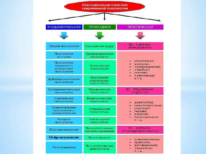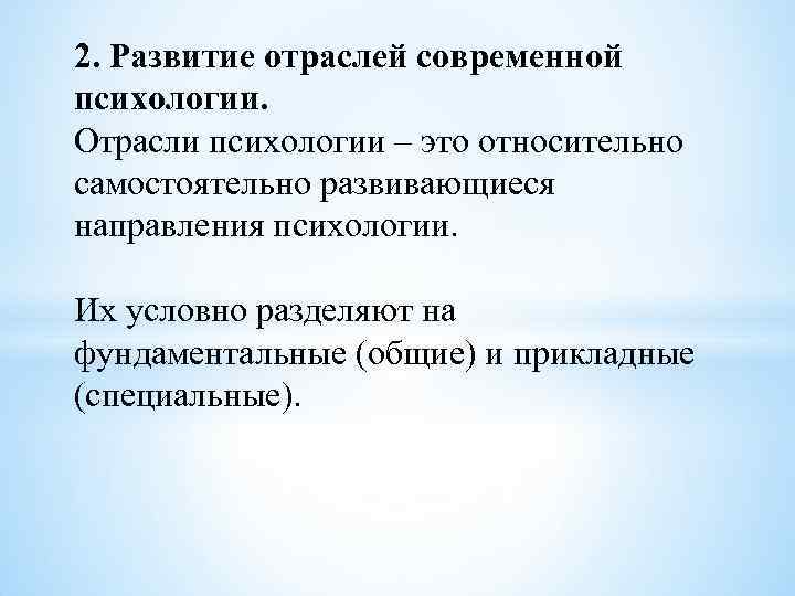 2. Развитие отраслей современной психологии. Отрасли психологии – это относительно самостоятельно развивающиеся направления психологии. Их условно разделяют на фундаментальные (общие) и прикладные (специальные).