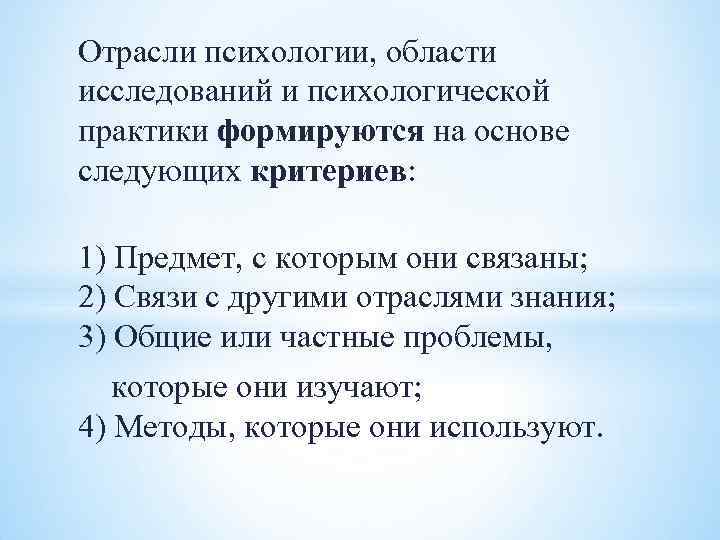 Отрасли психологии, области исследований и психологической практики формируются на основе следующих критериев: 1) Предмет, с которым они связаны; 2) Связи с другими отраслями знания; 3) Общие или частные проблемы, которые они изучают; 4) Методы, которые они используют.