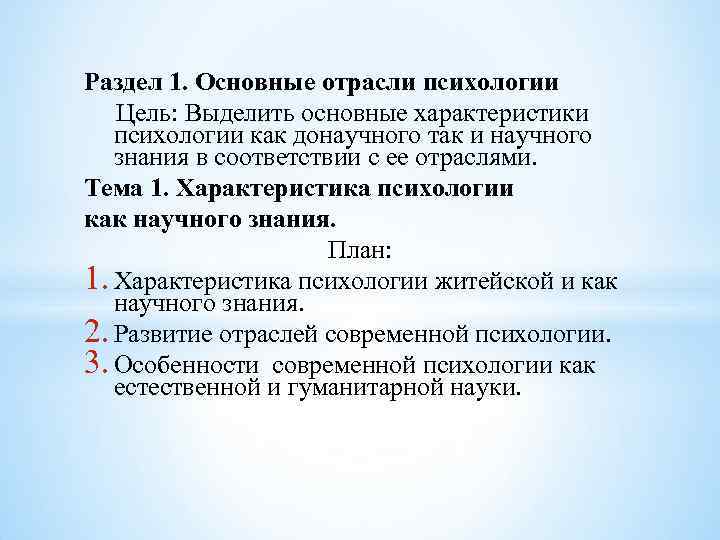 Раздел 1. Основные отрасли психологии Цель: Выделить основные характеристики психологии как донаучного так и научного знания в соответствии с ее отраслями. Тема 1. Характеристика психологии как научного знания. План: 1. Характеристика психологии житейской и как научного знания. 2. Развитие отраслей современной психологии. 3. Особенности современной психологии как естественной и гуманитарной науки.