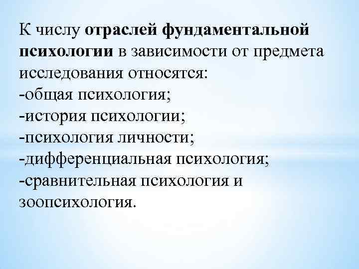 К числу отраслей фундаментальной психологии в зависимости от предмета исследования относятся: -общая психология; -история психологии; -психология личности; -дифференциальная психология; -сравнительная психология и зоопсихология.