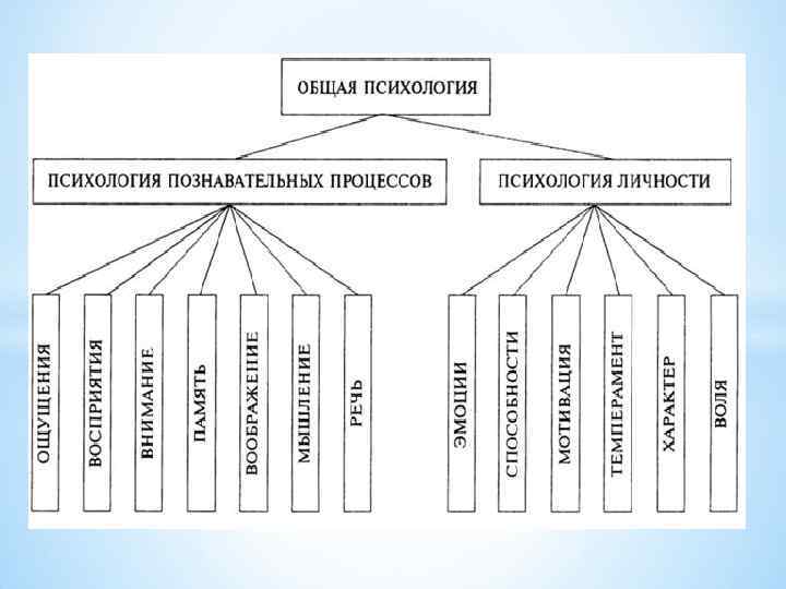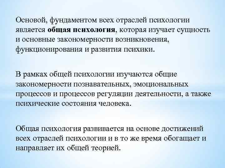Основой, фундаментом всех отраслей психологии является общая психология, которая изучает сущность и основные закономерности возникновения, функционирования и развития психики. В рамках общей психологии изучаются общие закономерности познавательных, эмоциональных процессов и процессов регуляции деятельности, а также психические состояния человека. Общая психология развивается на основе достижений всех отраслей психологии и в то же время обогащает и направляет их общей теорией.