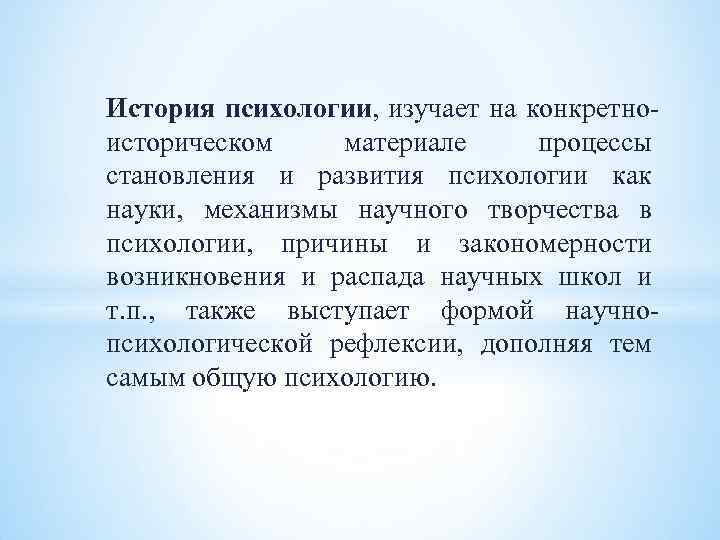История психологии, изучает на конкретноисторическом материале процессы становления и развития психологии как науки, механизмы научного творчества в психологии, причины и закономерности возникновения и распада научных школ и т. п. , также выступает формой научнопсихологической рефлексии, дополняя тем самым общую психологию.