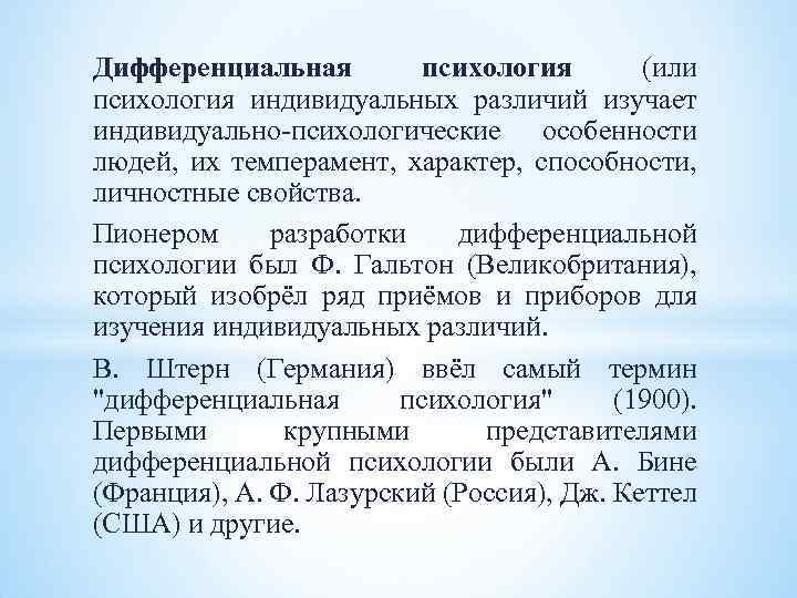 Дифференциальная психология (или психология индивидуальных различий изучает индивидуально-психологические особенности людей, их темперамент, характер, способности, личностные свойства. Пионером разработки дифференциальной психологии был Ф. Гальтон (Великобритания), который изобрёл ряд приёмов и приборов для изучения индивидуальных различий. В. Штерн (Германия) ввёл самый термин "дифференциальная психология" (1900). Первыми крупными представителями дифференциальной психологии были А. Бине (Франция), А. Ф. Лазурский (Россия), Дж. Кеттел (США) и другие.