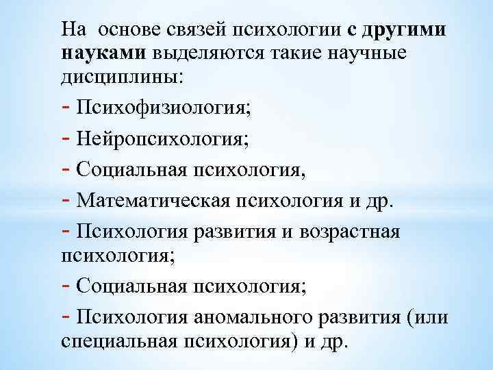 На основе связей психологии с другими науками выделяются такие научные дисциплины: - Психофизиология; - Нейропсихология; - Социальная психология, - Математическая психология и др. - Психология развития и возрастная психология; - Социальная психология; - Психология аномального развития (или специальная психология) и др.