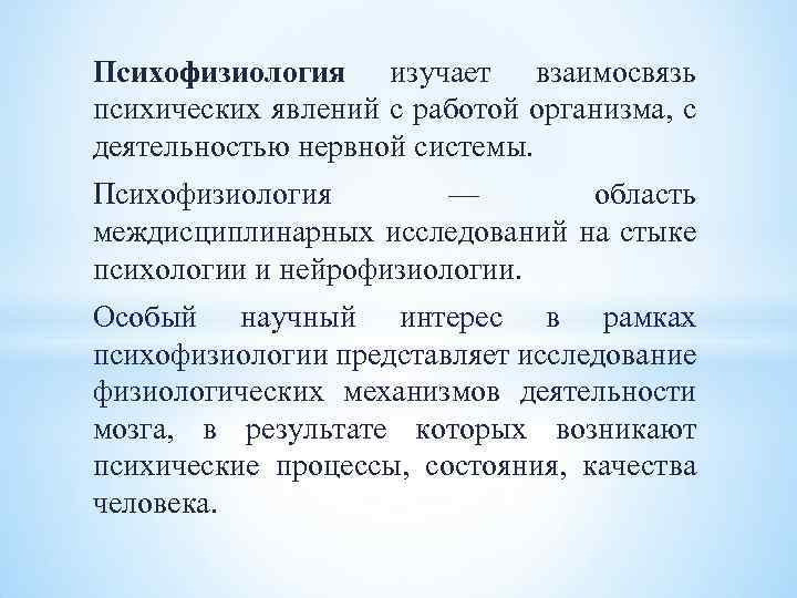 Психофизиология изучает взаимосвязь психических явлений с работой организма, с деятельностью нервной системы. Психофизиология — область междисциплинарных исследований на стыке психологии и нейрофизиологии. Особый научный интерес в рамках психофизиологии представляет исследование физиологических механизмов деятельности мозга, в результате которых возникают психические процессы, состояния, качества человека.