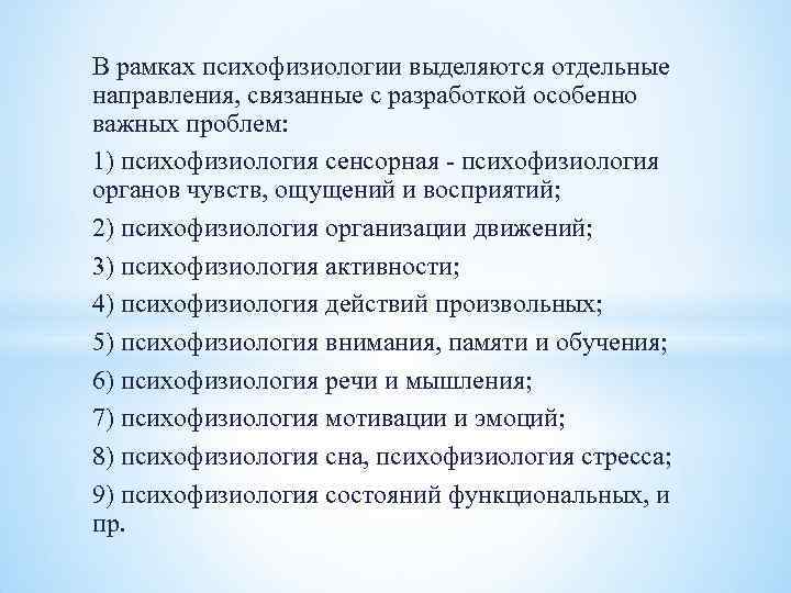 В рамках психофизиологии выделяются отдельные направления, связанные с разработкой особенно важных проблем: 1) психофизиология сенсорная - психофизиология органов чувств, ощущений и восприятий; 2) психофизиология организации движений; 3) психофизиология активности; 4) психофизиология действий произвольных; 5) психофизиология внимания, памяти и обучения; 6) психофизиология речи и мышления; 7) психофизиология мотивации и эмоций; 8) психофизиология сна, психофизиология стресса; 9) психофизиология состояний функциональных, и пр.