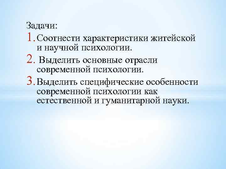 Задачи: 1. Соотнести характеристики житейской и научной психологии. 2. Выделить основные отрасли современной психологии. 3. Выделить специфические особенности современной психологии как естественной и гуманитарной науки.