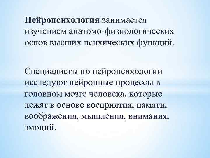 Нейропсихология занимается изучением анатомо-физиологических основ высших психических функций. Специалисты по нейропсихологии исследуют нейронные процессы в головном мозге человека, которые лежат в основе восприятия, памяти, воображения, мышления, внимания, эмоций.