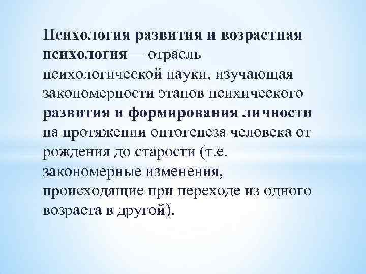 Психология развития и возрастная психология— отрасль психологической науки, изучающая закономерности этапов психического развития и формирования личности на протяжении онтогенеза человека от рождения до старости (т. е. закономерные изменения, происходящие при переходе из одного возраста в другой).