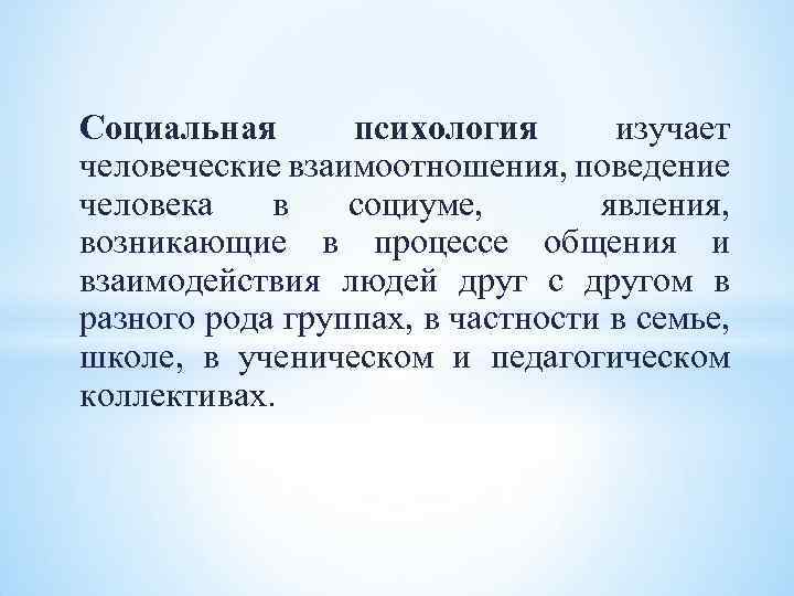 Социальная психология изучает человеческие взаимоотношения, поведение человека в социуме, явления, возникающие в процессе общения и взаимодействия людей друг с другом в разного рода группах, в частности в семье, школе, в ученическом и педагогическом коллективах.