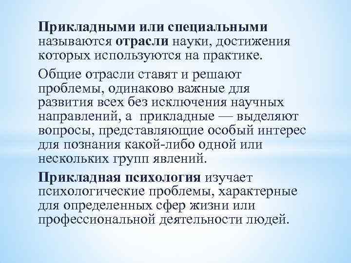 Прикладными или специальными называются отрасли науки, достижения которых используются на практике. Общие отрасли ставят и решают проблемы, одинаково важные для развития всех без исключения научных направлений, а прикладные — выделяют вопросы, представляющие особый интерес для познания какой-либо одной или нескольких групп явлений. Прикладная психология изучает психологические проблемы, характерные для определенных сфер жизни или профессиональной деятельности людей.