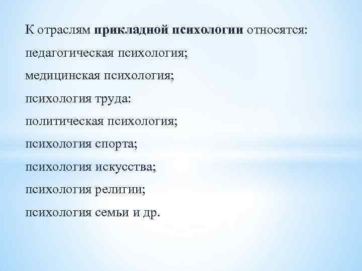 К отраслям прикладной психологии относятся: педагогическая психология; медицинская психология; психология труда: политическая психология; психология спорта; психология искусства; психология религии; психология семьи и др.