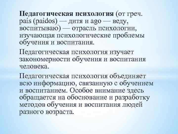 Педагогическая психология (от греч. pais (paidos) — дитя и ago — веду, воспитываю) — отрасль психологии, изучающая психологические проблемы обучения и воспитания. Педагогическая психология изучает закономерности обучения и воспитания человека. Педагогическая психология объединяет всю информацию, связанную с обучением и воспитанием. Особое внимание здесь обращается на обоснование и разработку методов обучения и воспитания людей разного возраста.