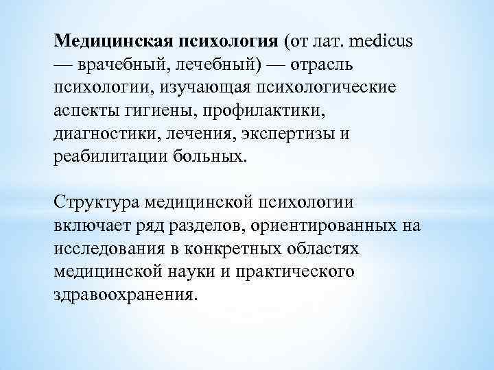Медицинская психология (от лат. medicus — врачебный, лечебный) — отрасль психологии, изучающая психологические аспекты гигиены, профилактики, диагностики, лечения, экспертизы и реабилитации больных. Структура медицинской психологии включает ряд разделов, ориентированных на исследования в конкретных областях медицинской науки и практического здравоохранения.