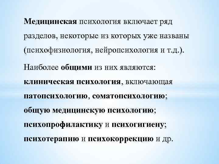 Медицинская психология включает ряд разделов, некоторые из которых уже названы (психофизиология, нейропсихология и т. д. ). Наиболее общими из них являются: клиническая психология, включающая патопсихологию, соматопсихологию; общую медицинскую психологию; психопрофилактику и психогигиену; психотерапию и психокоррекцию и др.