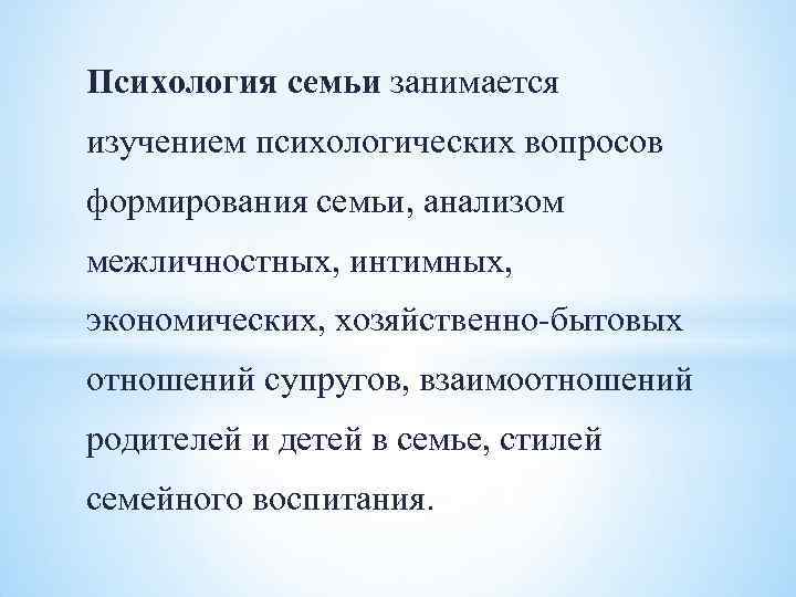 Психология семьи занимается изучением психологических вопросов формирования семьи, анализом межличностных, интимных, экономических, хозяйственно-бытовых отношений супругов, взаимоотношений родителей и детей в семье, стилей семейного воспитания.