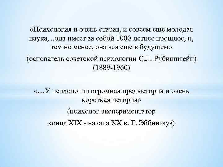 «Психология и очень старая, и совсем еще молодая наука, . . она имеет за собой 1000 -летнее прошлое, и, тем не менее, она вся еще в будущем» (основатель советской психологии С. Л. Рубинштейн) (1889 -1960) «…У психологии огромная предыстория и очень короткая история» (психолог-экспериментатор конца XIX - начала XX в. Г. Эббингауз)