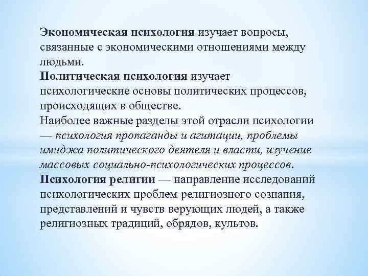 Экономическая психология изучает вопросы, связанные с экономическими отношениями между людьми. Политическая психология изучает психологические основы политических процессов, происходящих в обществе. Наиболее важные разделы этой отрасли психологии — психология пропаганды и агитации, проблемы имиджа политического деятеля и власти, изучение массовых социально-психологических процессов. Психология религии — направление исследований психологических проблем религиозного сознания, представлений и чувств верующих людей, а также религиозных традиций, обрядов, культов.