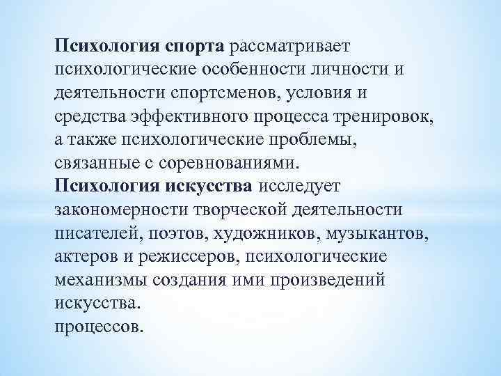Психология спорта рассматривает психологические особенности личности и деятельности спортсменов, условия и средства эффективного процесса тренировок, а также психологические проблемы, связанные с соревнованиями. Психология искусства исследует закономерности творческой деятельности писателей, поэтов, художников, музыкантов, актеров и режиссеров, психологические механизмы создания ими произведений искусства. процессов.