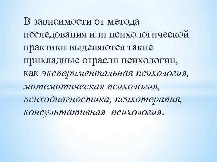 В зависимости от метода исследования или психологической практики выделяются такие прикладные отрасли психологии, как экспериментальная психология, математическая психология, психодиагностика, психотерапия, консультативная психология.