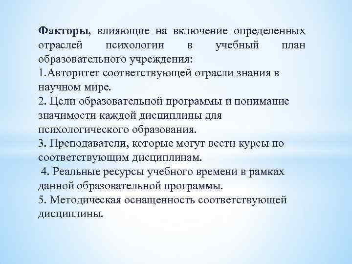 Факторы, влияющие на включение определенных отраслей психологии в учебный план образовательного учреждения: 1. Авторитет соответствующей отрасли знания в научном мире. 2. Цели образовательной программы и понимание значимости каждой дисциплины для психологического образования. 3. Преподаватели, которые могут вести курсы по соответствующим дисциплинам. 4. Реальные ресурсы учебного времени в рамках данной образовательной программы. 5. Методическая оснащенность соответствующей дисциплины.