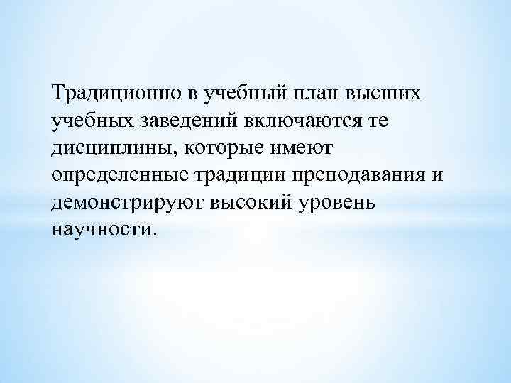 Традиционно в учебный план высших учебных заведений включаются те дисциплины, которые имеют определенные традиции преподавания и демонстрируют высокий уровень научности.