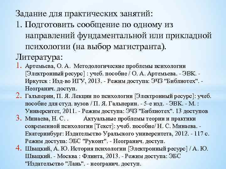 Задание для практических занятий: 1. Подготовить сообщение по одному из направлений фундаментальной или прикладной психологии (на выбор магистранта). Литература: 1. 2. 3. 4. Артемьева, О. А. Методологические проблемы психологии [Электронный ресурс] : учеб. пособие / О. А. Артемьева. - ЭВК. - Иркутск : Изд-во ИГУ, 2013. - Режим доступа: ЭЧЗ "Библиотех". - Неогранич. доступ. Гальперин, П. Я. Лекции по психологии [Электронный ресурс]: учеб. пособие для студ. вузов / П. Я. Гальперин. - 5 -е изд. - ЭВК. - М. : Университет, 2011. - Режим доступа: ЭЧЗ "Библиотех". 13 доступов Минаева, Н. С. . Актуальные проблемы теории и практики современной психологии [Текст]: учеб. пособие/ Н. С. Минаева. - Екатеринбург: Издательство Уральского университета, 2012. - 117 с. Режим доступа: ЭБС "Руконт". - Неогранич. доступ. Швацкий, А. Ю. История психологии [Электронный ресурс] / А. Ю. Швацкий. - Москва : Флинта, 2013. - Режим доступа: ЭБС "Издательство "Лань". - неогранич. доступ.