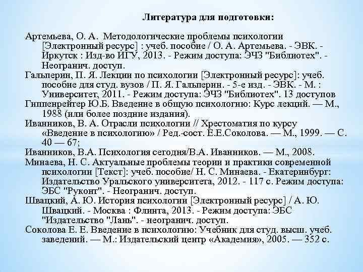 Литература для подготовки: Артемьева, О. А. Методологические проблемы психологии [Электронный ресурс] : учеб. пособие / О. А. Артемьева. - ЭВК. - Иркутск : Изд-во ИГУ, 2013. - Режим доступа: ЭЧЗ "Библиотех". - Неогранич. доступ. Гальперин, П. Я. Лекции по психологии [Электронный ресурс]: учеб. пособие для студ. вузов / П. Я. Гальперин. - 5 -е изд. - ЭВК. - М. : Университет, 2011. - Режим доступа: ЭЧЗ "Библиотех". 13 доступов Гиппенрейтер Ю. Б. Введение в общую психологию: Курс лекций. — М. , 1988 (или более поздние издания). Иванников, В. А. Отрасли психологии // Хрестоматия по курсу «Введение в психологию» / Ред. -сост. Е. Е. Соколова. — М. , 1999. — С. 40 — 67; Иванников, В. А. Психология сегодня/В. А. Иванников. — М. , 2008. Минаева, Н. С. Актуальные проблемы теории и практики современной психологии [Текст]: учеб. пособие/ Н. С. Минаева. - Екатеринбург: Издательство Уральского университета, 2012. - 117 с. Режим доступа: ЭБС "Руконт". - Неогранич. доступ. Швацкий, А. Ю. История психологии [Электронный ресурс] / А. Ю. Швацкий. - Москва : Флинта, 2013. - Режим доступа: ЭБС "Издательство "Лань". - неогранич. доступ. Соколова Е. Е. Введение в психологию: Учебник для студ. высш. учеб. заведений. — М. : Издательский центр «Академия» , 2005. — 352 с.