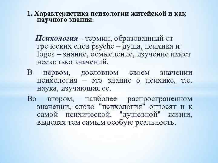 1. Характеристика психологии житейской и как научного знания. Психология - термин, образованный от греческих слов psyche – душа, психика и logos – знание, осмысление, изучение имеет несколько значений. В первом, дословном своем значении психология – это знание о психике, т. е. наука, изучающая ее. Во втором, наиболее распространенном значении, слово "психология" относят и к самой психической, "душевной" жизни, выделяя тем самым особую реальность.