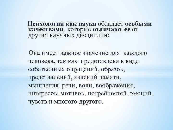 Психология как наука обладает особыми качествами, которые отличают ее от других научных дисциплин: Она имеет важное значение для каждого человека, так как представлена в виде собственных ощущений, образов, представлений, явлений памяти, мышления, речи, воли, воображения, интересов, мотивов, потребностей, эмоций, чувств и многого другого.