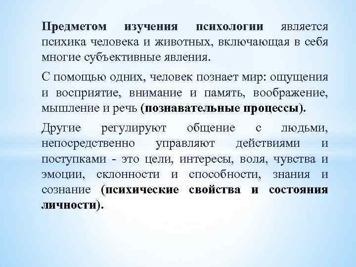 Предметом изучения психологии является психика человека и животных, включающая в себя многие субъективные явления. С помощью одних, человек познает мир: ощущения и восприятие, внимание и память, воображение, мышление и речь (познавательные процессы). Другие регулируют общение с людьми, непосредственно управляют действиями и поступками - это цели, интересы, воля, чувства и эмоции, склонности и способности, знания и сознание (психические свойства и состояния личности).