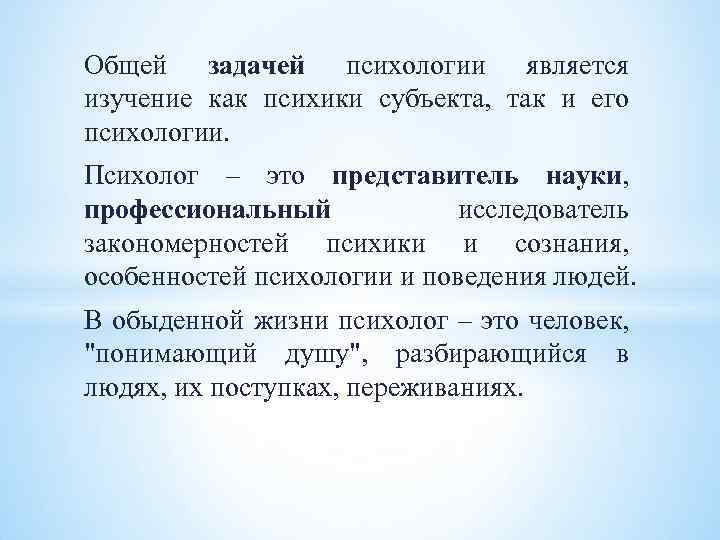 Общей задачей психологии является изучение как психики субъекта, так и его психологии. Психолог – это представитель науки, профессиональный исследователь закономерностей психики и сознания, особенностей психологии и поведения людей. В обыденной жизни психолог – это человек, "понимающий душу", разбирающийся в людях, их поступках, переживаниях.