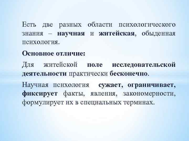 Есть две разных области психологического знания – научная и житейская, обыденная психология. Основное отличие: Для житейской поле исследовательской деятельности практически бесконечно. Научная психология сужает, ограничивает, фиксирует факты, явления, закономерности, формулирует их в специальных терминах.