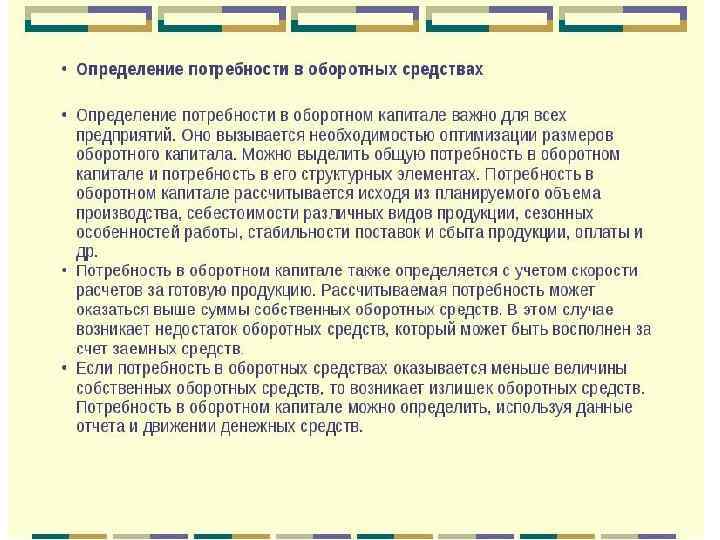 2 вопрос. Определение потребности в оборотных средствах • При формировании уставного фонда (капитала) предприятие самостоятельно устанавливает плановый размер оборотных средств, необходимый для его производственной деятельности, в виде нор матива в денежном выражении. • Потребность предприятия в обо ротных средствах колеблется в течение года вследствие сезонности производства, неравномерности поступления денег за отгружен ную продукцию и других факторов. • Потребность в оборотных средствах в условиях рынка часто на зывают эксплуатационными потребностями или финансово экс плуатационными потребностями (ФЭП), которые определяются как разница между средствами, иммобилизованными в запасах, и клиентской задолженности, и задолженностью предприятия постав щикам.