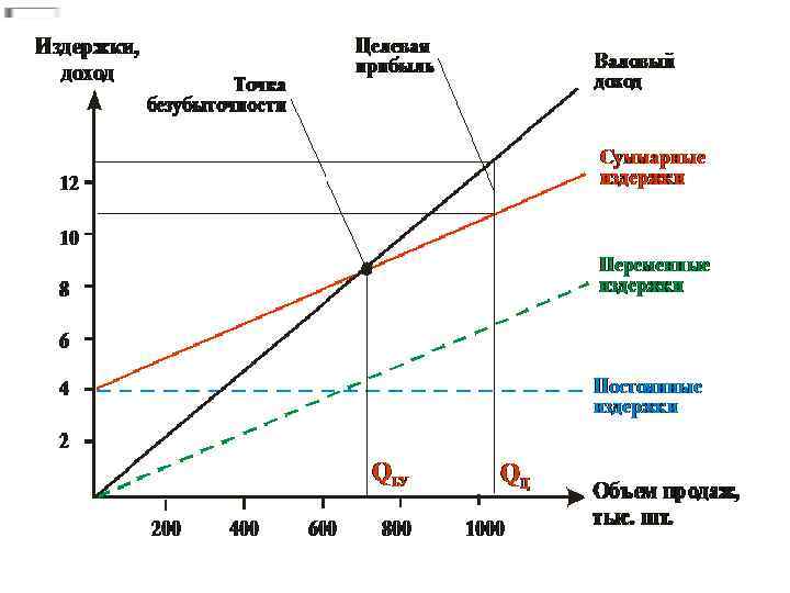 Точка безубыточности (критическая точка, CVP точка ) — объём производства и реализации продукции, при котором расходы будут компенсированы доходами, а при производстве и реализации каждой последующей единицы продукции предприятие начинает получать прибыль. Точка безубыточности в денежном выражении — такая минимальная величина дохода, при которой полностью окупаются все издержки (прибыль при этом равна нулю). Постоя нные затра ты — элемент модели точки безубыточности, представляющий собой затраты, которые не зависят от величины объёма выпуска. Увеличение объёмов производства приводит к уменьшению постоянных расходов, приходящихся на единицу продукции, что повышает прибыль с единицы продукции за счёт положительного эффекта масштаба. Переме нные затраты — затраты, величина которых зависит от объёма выпуска и реализации продукции (исчезают при остановке производства) Общие (совокупные) затраты = Постоя нные затра ты + Переме нные затраты