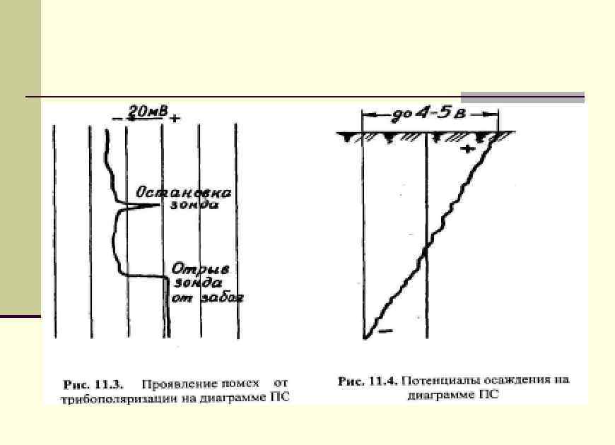 Потенциалы осаждения (седиментационные) n Возникают при использовании некачественного бурового раствора в процессе бурения. Такой раствор не удерживает в себе шлам, который осаждаясь на забой, избирательно сорбируют анионы. n В результате от забоя к устью наблюдается повышение потенциала ПС, достигающее иногда нескольких В. n Выделить аномалии, связанные с изменением литологии разреза на фоне такой помехи, практически невозможно. n Для устранения влияния седиментационных потенциалов скважину перед каротажем необходимо промыть кондиционным буровым раствором или чистой водой. n