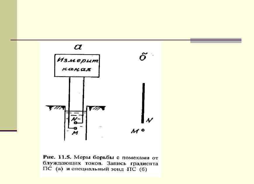 Потенциалы осуждающих и теллурических токов n n n n Теллурические токи имеют естественное происхождение, они являются частью общего электромагнитного поля Земли. Блуждающие токи имеют промышленное происхождение. Блуждающие токи распространяются на десятки км от источника. При записи ПС теллурические и блуждающие токи создают помехи, амплитуда которых пропорциональна плотности этих токов в данный момент, среднему УЭС среды между электродами М и N и расстоянию между ними. Эти помехи искажают диаграммы ПС, а иногда и не дают возможности их записать - при неподвижном зонде показания регистрирующего прибора непрерывно меняются, блик гальванометра "бродит" по диаграмме. Одна из основных мер по устранению помех блуждающих токов - это выбор времени, когда они имеют наименьшую интенсивность. Кроме того, влияние этих помех можно исключить, записывая градиент потенциала ПС или применяя специальные зонды. При записи градиента ПС помеха минимальна, поскольку электроды М и N находятся очень близко друг к другy однако диаграммы grad Unc слишком изрезаны и трудно интерпретируются. Специальный зонд ПС состоит из точечного электрода М и линейного электрода N. Линейный электрод осредняет потенциал ПС в скважине на всем своем протяжении, благодаря чему он меняется мало и не резко, а малое расстояние между М и N обеспечивает близкое значение потенциала, создаваемого на этих электродах блуждающими токами.