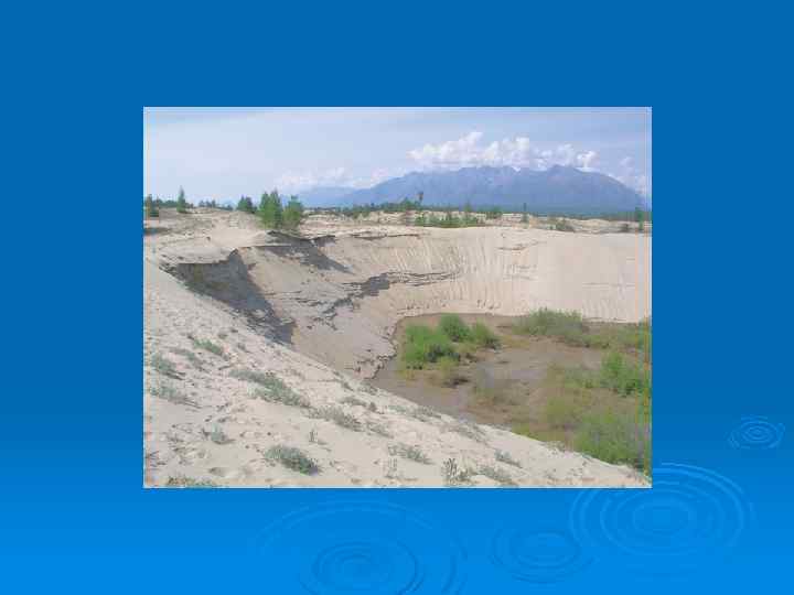Описание геологического разреза Ø Неблагоприятные экзогенные геологические процессы на участке Эрозия – разрушение и снос верхних пород ветром (ветровая) и потоками воды (водная) Ветровая эрозия может наблюдаться на участке скв. № 3, 4, 5, где верхним слоем является суглинок, не защищённый растительностью Водная эрозия наблюдается на склоне (скв. № 3, 4), т. к. мелкие частицы будут смещаться вниз по склону дождевыми и талыми водами. У основания склона вследствие уменьшения уклона поверхности и изменения скорости течения эти частицы оседают. Так в нижних частях склона постепенно будут накапливаться делювиальные отложения. Ø