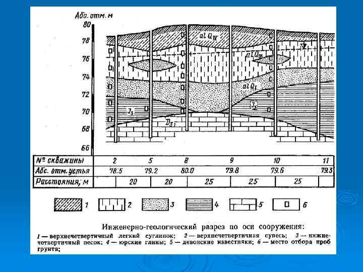 Описание геологического разреза Анализ горных пород Согласно разрезу имеются исключительно осадочные горные породы Верхний слой на скв. № 1, 2, 5 – представлен растительным слоем толщиной 1 м, на 3, 4 – суглинком (толщиной до 10 м) Под верхним слоем залегают лёсс и супесь Далее идёт водоносный слой из песка, который есть по всей длине разреза. Мощность его колеблется от 2, 0 до 6, 0 м. Под песком залегают суглинки и глина, являющиеся водоупорами Последними слоями являются известняк, глина и песок. Их мощность составляет от 1, 0 м до 5, 0 м Скальные грунты представлены известняками, дисперсные – глинами, песками, супесями По характеру структурных связей глины являются связными, пластичными; пески и супеси – несвязными, рыхлыми