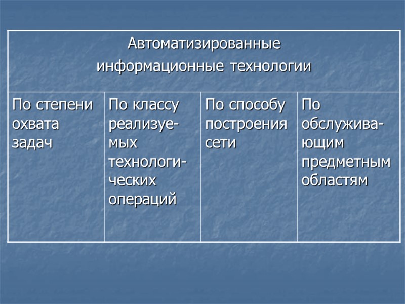 Виды информационных технологий по степени охвата задач управления 1. Информационные технологии обработки данных Информационная технология обработки данных применяется персоналом на уровне исполнительской деятельности. Информационные технологии обработки данных применимы только для хорошо структурированных задач. Основные компоненты этой технологии: сбор данных; обработка данных; хранение данных; создание отчетов. 2. Информационные технологии управления Информационные технологии управления используются на любом уровне управления. Целью этой технологии является удовлетворение информационных потребностей всех сотрудников фирмы, имеющих дело с принятием решения. ИТ предполагает наличие базы данных, содержимое которой при помощи соответствующего программного обеспечения преобразуются в периодические и специальные отчеты. На основе этих отчетов принимается решение по управлению процессами. С помощью этой технологии решаются следующие задачи: оценка планируемого состояния объекта управления; оценка отклонения от планируемого состояния; выявление причин отклонений; анализ возможных решений и действий.