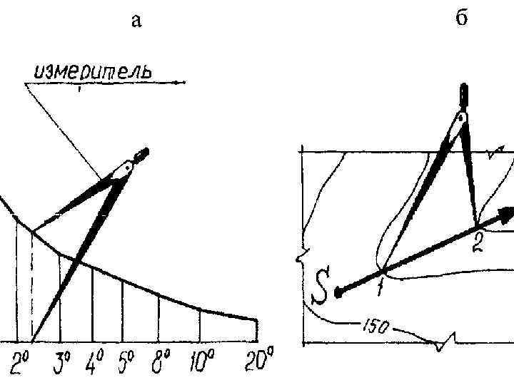 • При работе с картой или планом угол • • • наклона либо уклон ската определяют, пользуясь графиками, называемыми масштабами (или шкалами) заложений. Заложение является проекцией линии ската на горизонтальную плоскость. Шкала заложений помещается на каждом листе топографических карт масштабов 1 : 200 000 и крупнее, позволяет по измеренному на топографической карте заложению определить крутизну ската или угол наклона линии на скате по выбранному направлению. Для этого с плана раствором циркуля берут заложение между двумя горизонталями по данному скату, затем по графику находят то место, где расстояние между кривой и горизонтальной прямой равно этому заложению. Для найденной таким образом ординаты прочитывают значение ν или i по горизонтальной прямой На приведенных графиках отмечено звездочками: ν = 2, 9°, i = 0, 05 = 5%. Графики заложений к плану масштаба 1: 1000 при высоте сечения рельефа h = 1 м: а - для углов наклона, б - уклонов