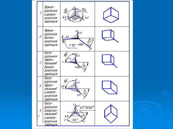 Косоугольная (фронтальная) изометрическая проекция Коэффициенты искажения по всем осям OX, OY и OZ равен 1 Ø Изображение воспринимается вытянутым Ø
